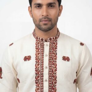 Ivory Elephant Embroidered Men’s Kurta – Royal Wedding & Festive Wear
