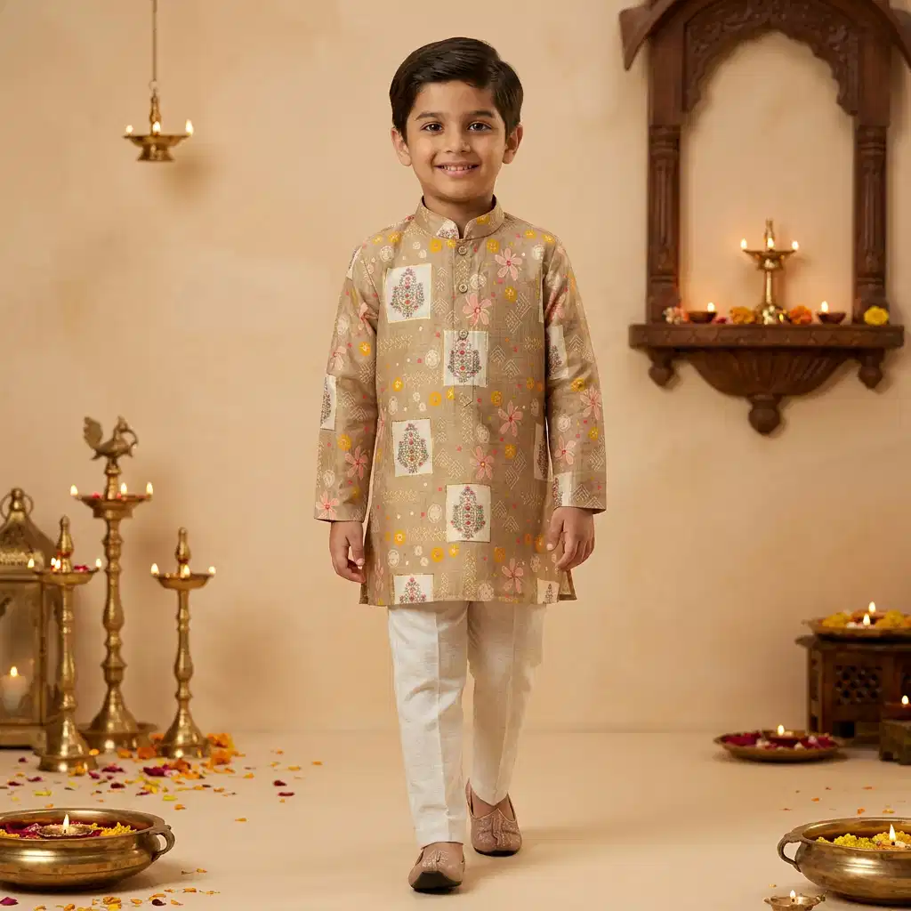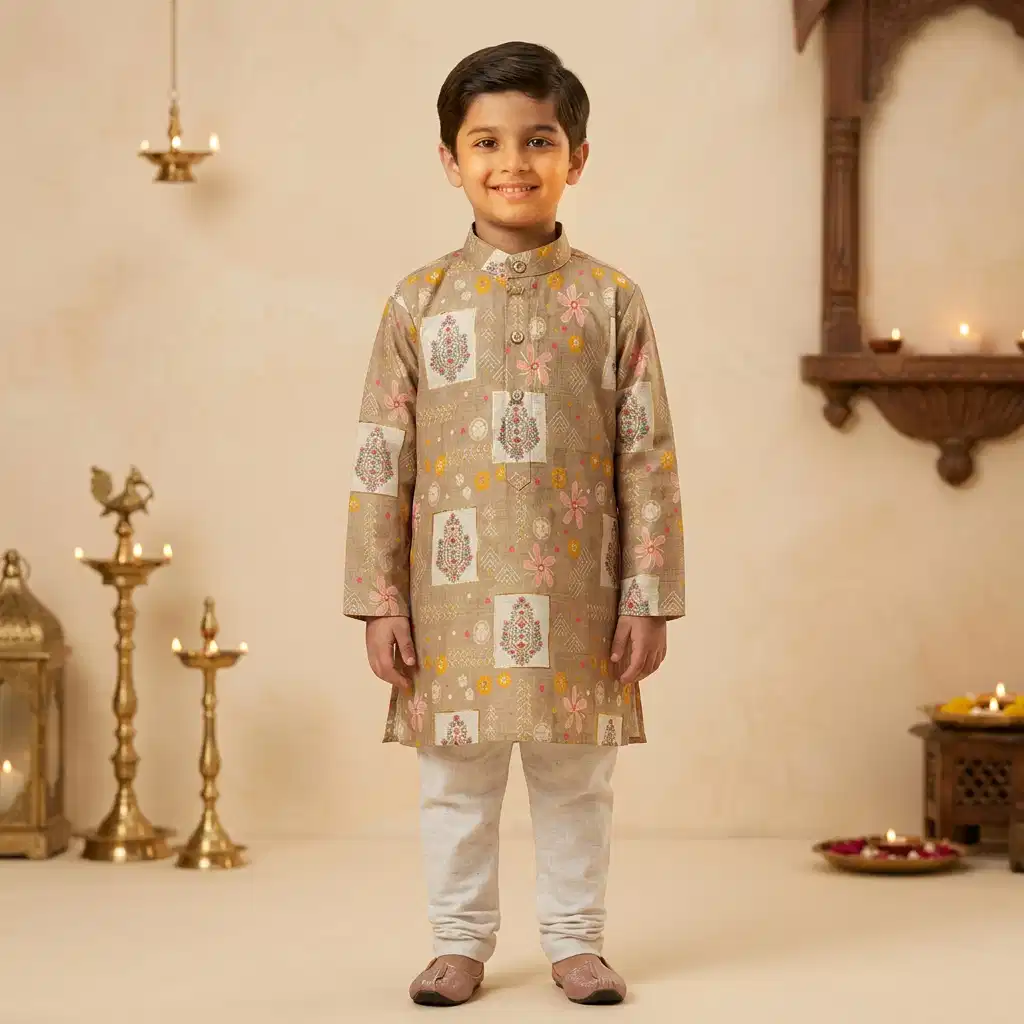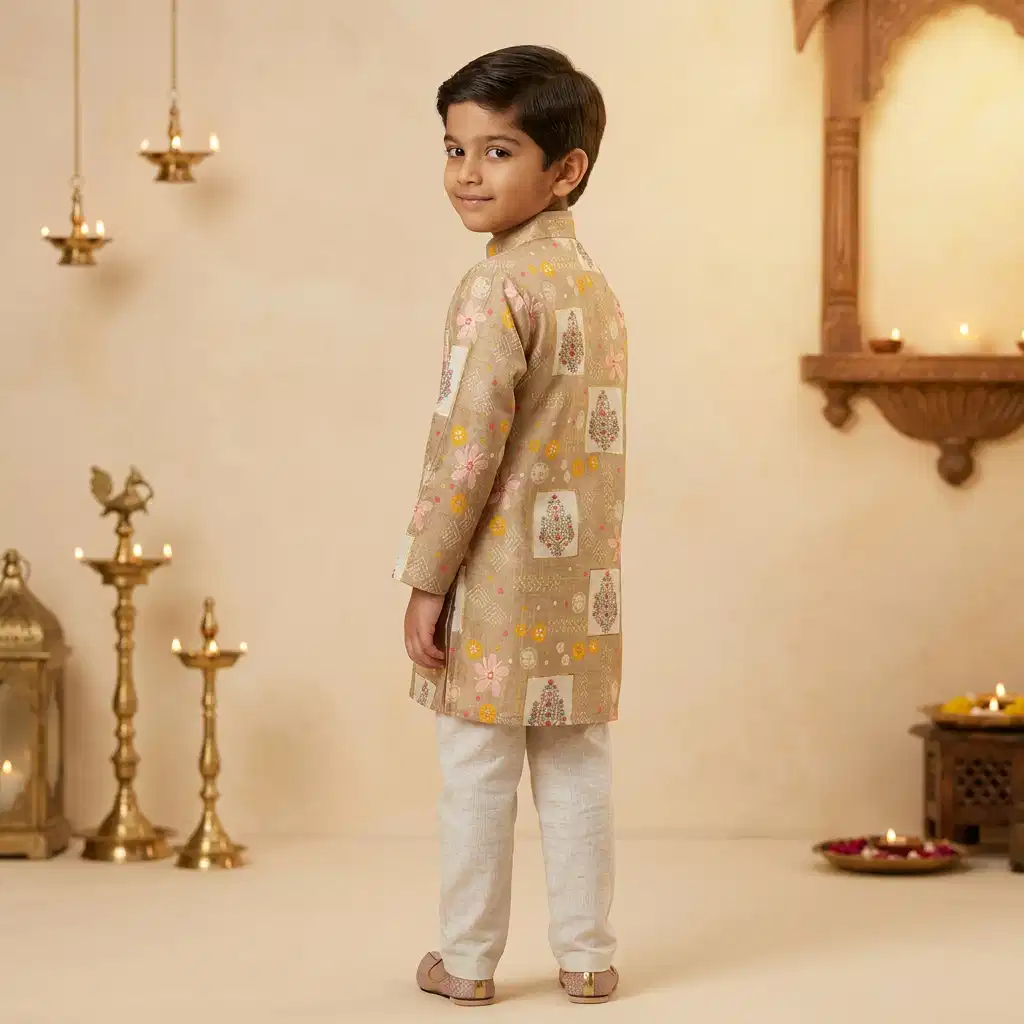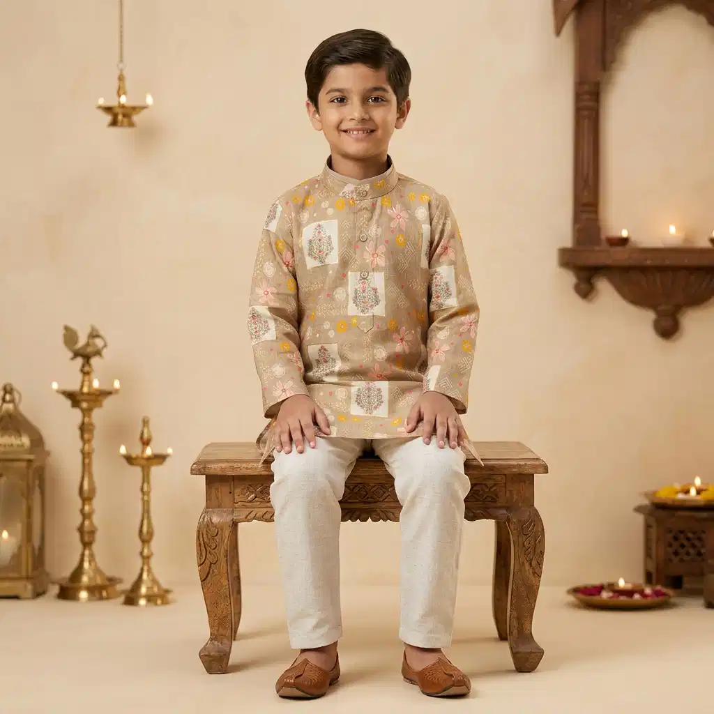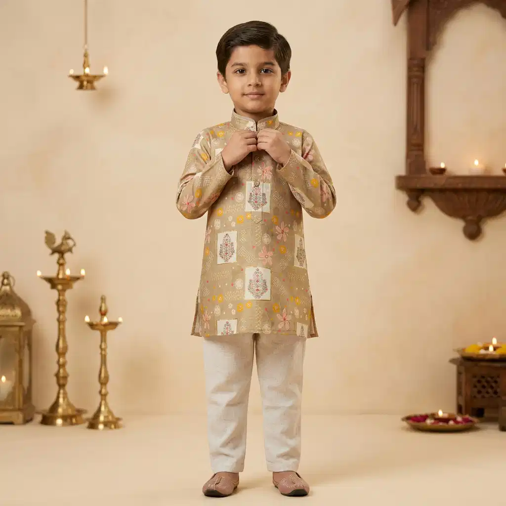 A sophisticated beige printed kurta paired with classic cream pajama, designed to give your child a graceful ethnic look for festivals, weddings, and traditional celebrations.