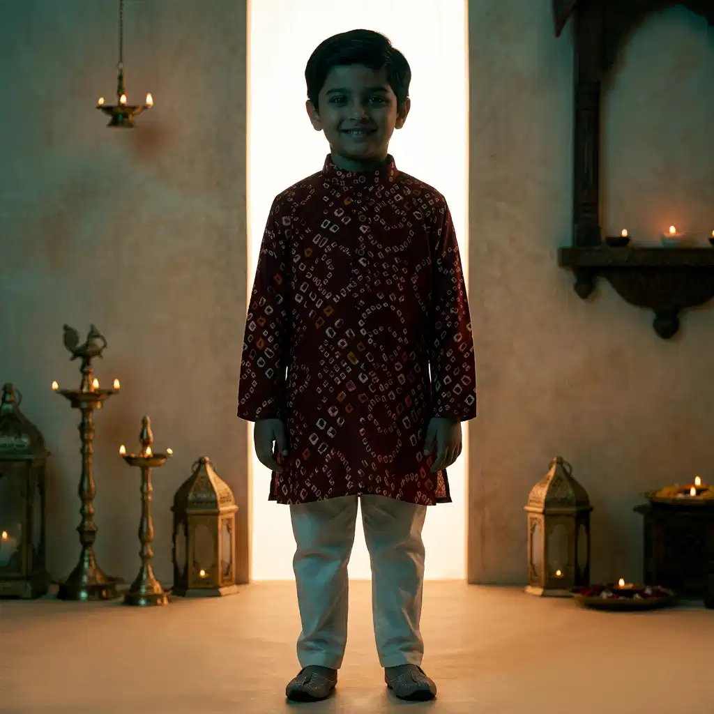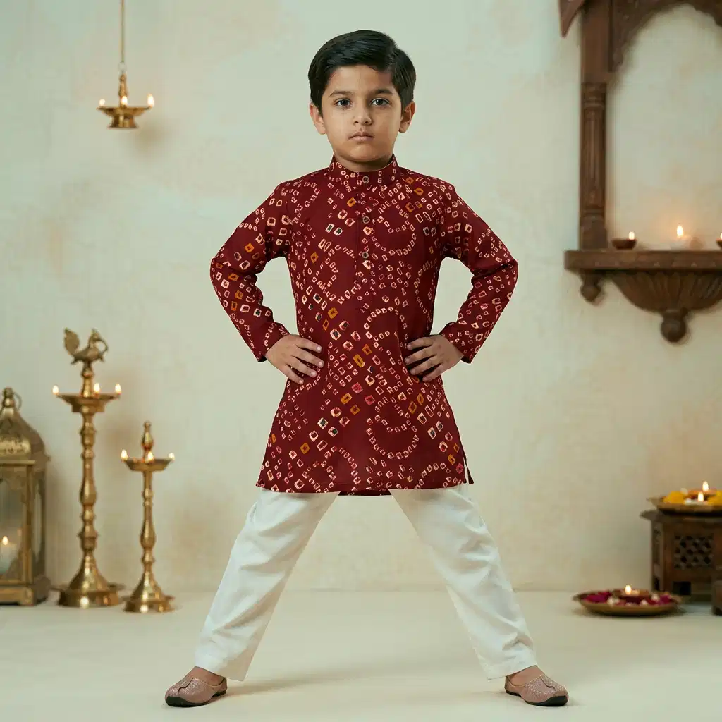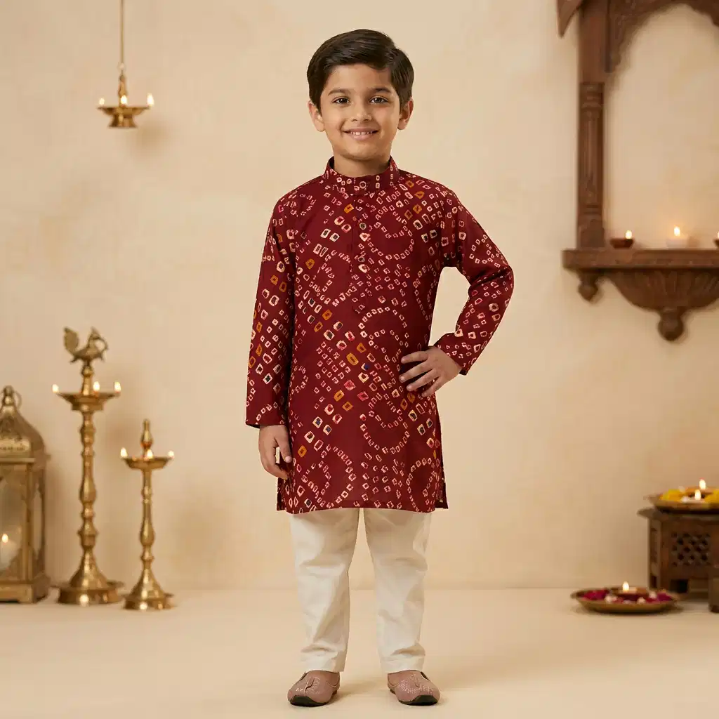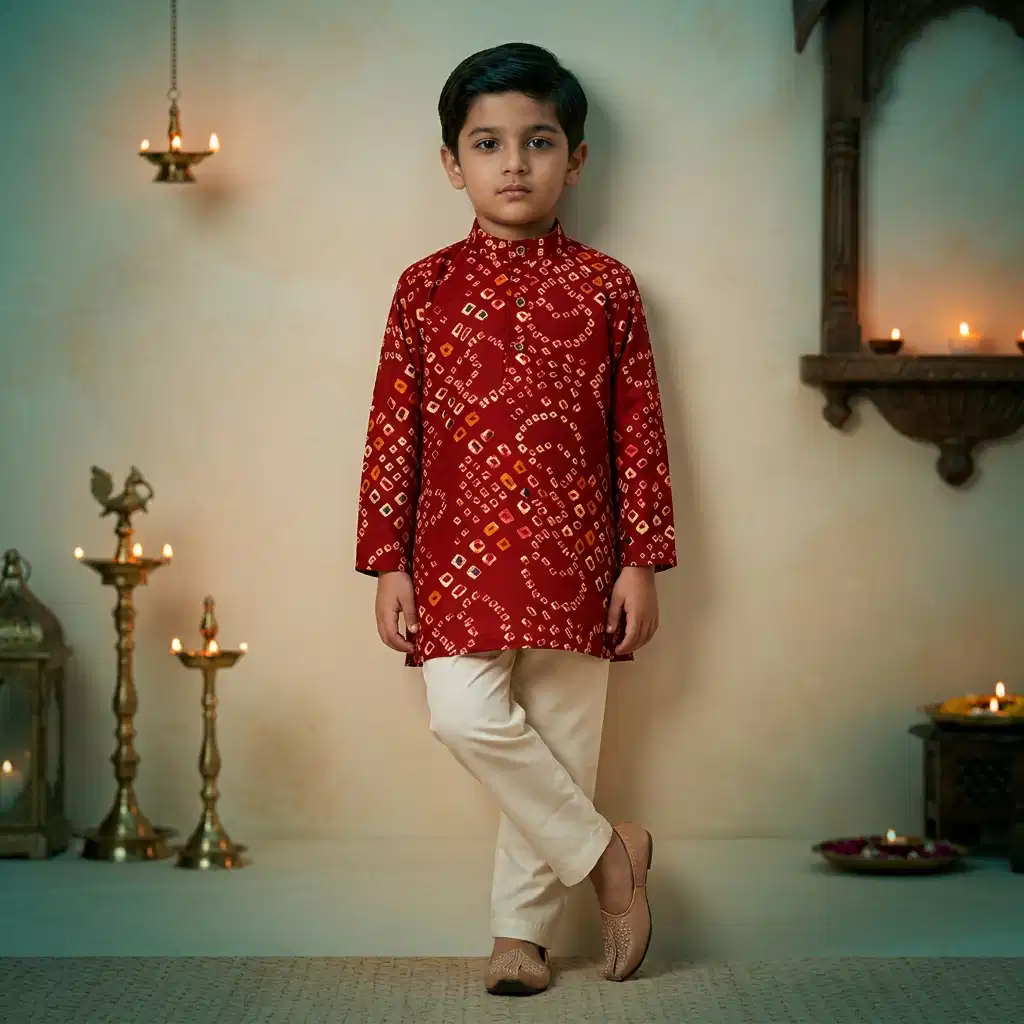 The detailed all-over print gives this kurta a festive Bandhani-inspired appeal, making it an excellent choice for celebrations and cultural occasions. The warm red tone symbolizes joy and festivity, allowing your little one to stand out gracefully during special events.